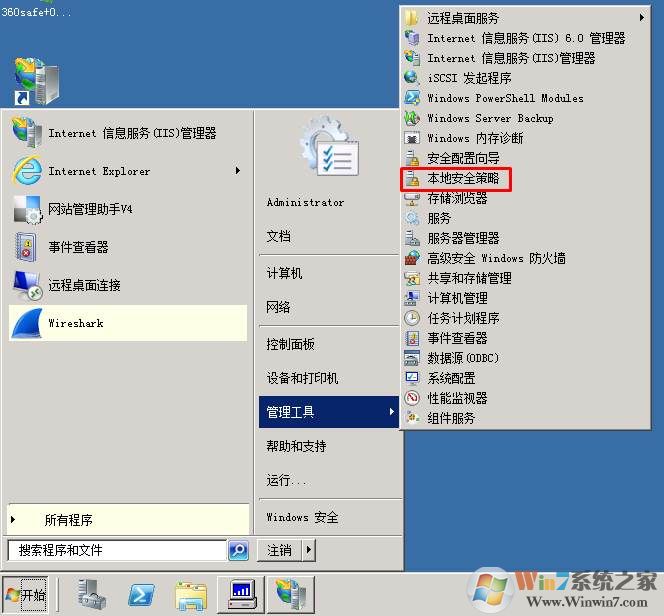 1、點(diǎn)擊開(kāi)始菜單,選擇【管理工具】—【本地安全策略】;