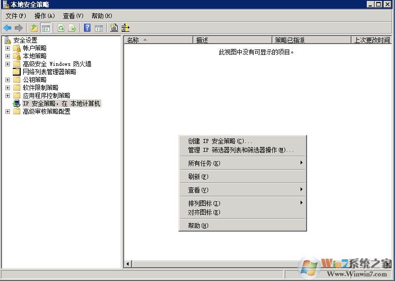 2、打開(kāi)之后,點(diǎn)擊【IP安全策略,在本地計(jì)算機(jī)】,然后在右側(cè)右鍵點(diǎn)擊,創(chuàng)建IP安全策略;
