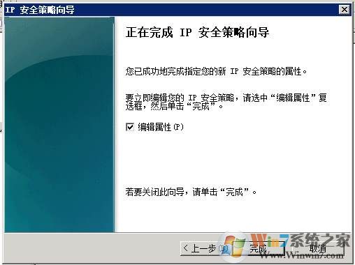 3、出現(xiàn)策略向?qū)е?,直到完成IP安全策略向?qū)?,點(diǎn)擊完成;(策略名稱大家可以填一下,比如禁用21端口)