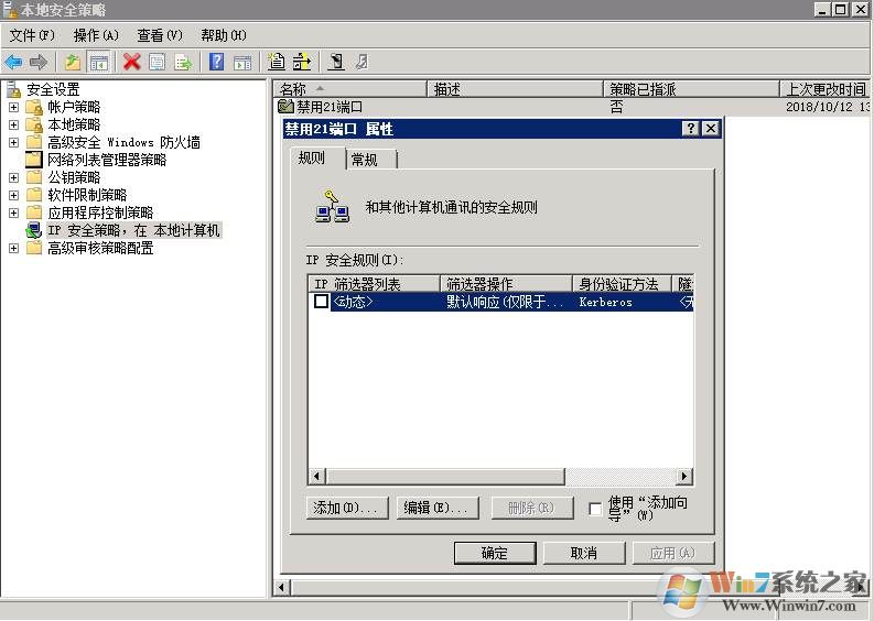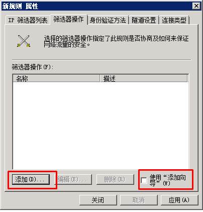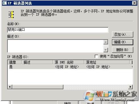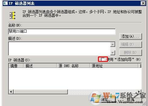 6、點(diǎn)擊添加,填寫(xiě)名稱“禁用21端口”,在頁(yè)面中取消“使用添加向?qū)?rdquo;的勾選,然后點(diǎn)“添加”,將彈出“IP篩選器屬性”。