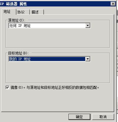 7、進(jìn)入“篩選器屬性”對(duì)話框,源地址選“任何IP地址”,目標(biāo)地址選“我的IP地址”。