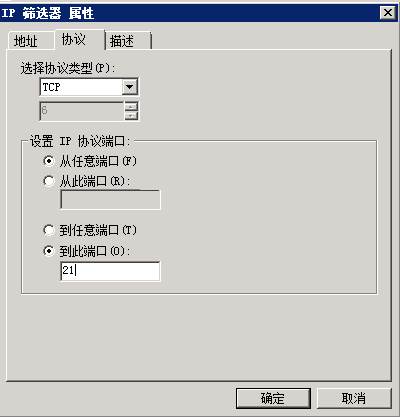 8、接下來(lái)點(diǎn)擊“協(xié)議”選項(xiàng)卡,在“選擇協(xié)議類(lèi)型”中選擇“TCP”,到此端口填“21”,接著點(diǎn)擊“描述”選項(xiàng)卡,填寫(xiě)描述“禁用21”,點(diǎn)擊“確定”。 Win7系統(tǒng)之家 cncxm.com