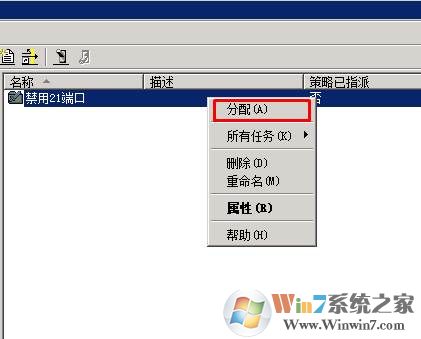 12、一路確定,然后回到IP安全策略后,右鍵點(diǎn)擊 禁用21端口,右鍵點(diǎn)擊選擇 分配即可;