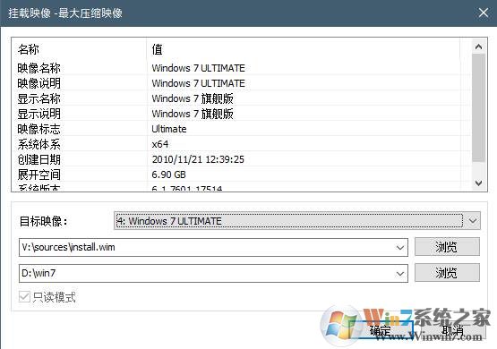 2、打開Dism++軟件,點(diǎn)擊文件->掛載映像,找到鏡像中的install.wim文件,然后指定一個(gè)只含英文名的文件夾作為掛載文件夾,然后選擇旗艦版并確認(rèn)。