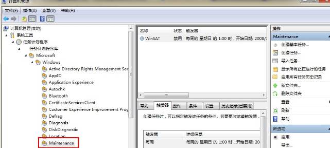 2、找到任務(wù)計(jì)劃程序--Microsoft--Windows--Maintenance,在右側(cè)可以看到WinSAT,禁用
