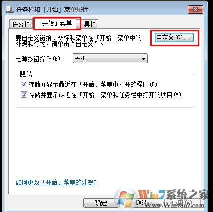 2、選擇開(kāi)始菜單,然后點(diǎn)擊“自定義“按鈕;