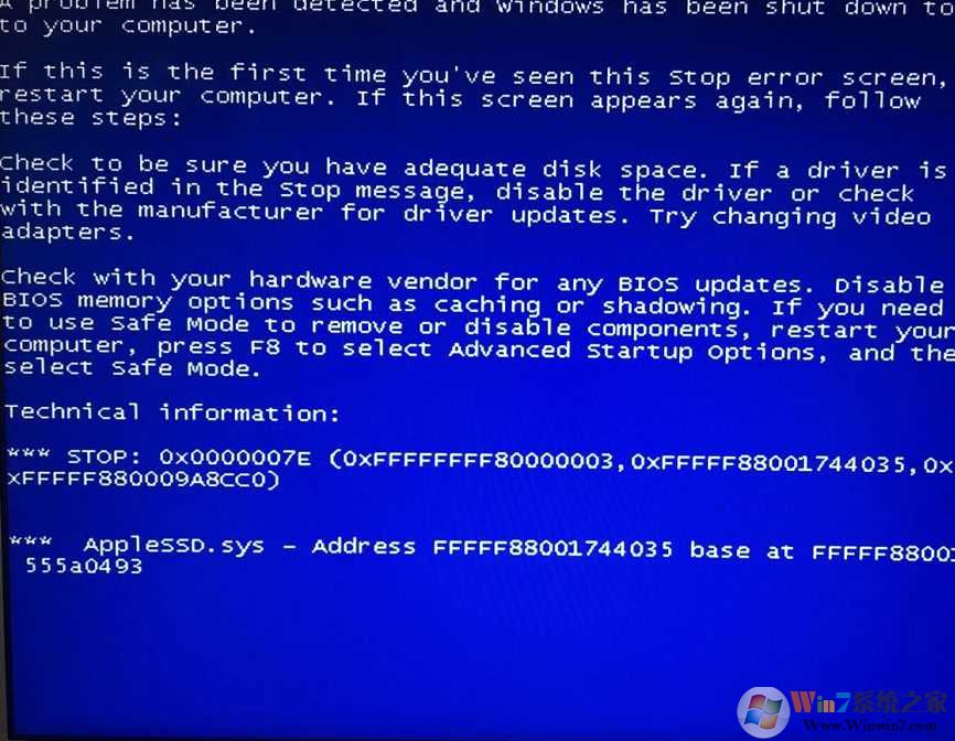 出現(xiàn)這個(gè)問題貌似是AppleSSD.sys和Win7不兼容導(dǎo)致的,大家可以按小編的方法試下,如果有更好的方法歡迎下方留言分享。