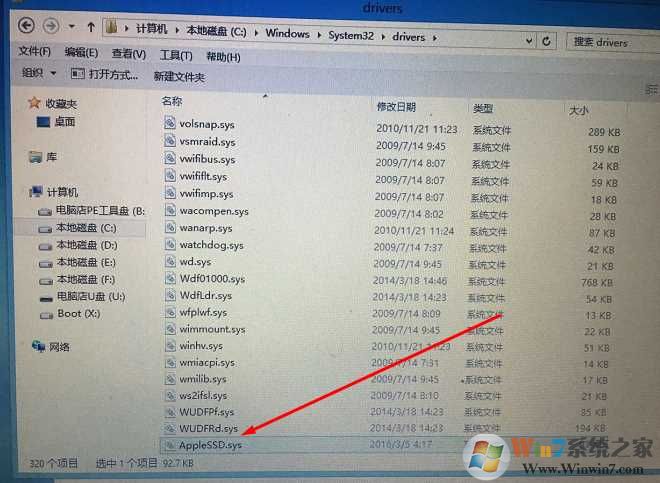 4、找到Windows所在磁盤,進(jìn)入\Windows\system32\drivers\ 文件夾,刪除AppleSSD.sys文件;Win7系統(tǒng)之家 cncxm.com