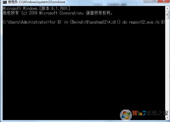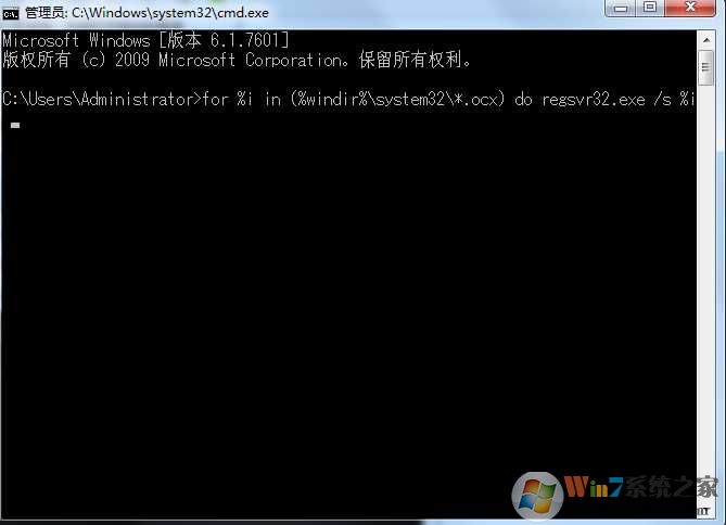 3.輸入 for %i in (%windir%\system32\*.ocx) do regsvr32.exe /s %i 回車(chē)-》等待結(jié)束