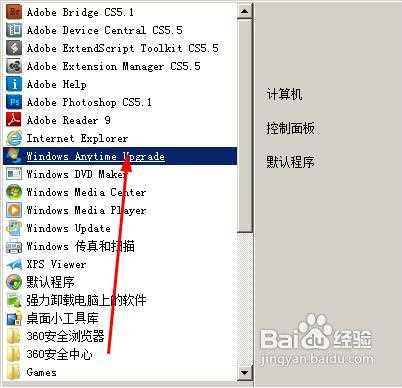 1、首先,我們點擊開始——所有程序,然后找到windows anytime upgrade,這是Win7系統(tǒng)升級的選項;