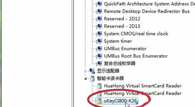 3、我們還會遇到提示說“獲取網(wǎng)銀盾序列號插件不可用”,這時你若打開電腦的設(shè)備管理器,你會發(fā)現(xiàn),在下面的“智能讀卡器”那里存在有一個黃色感嘆號的U盤驅(qū)動未正確安裝;