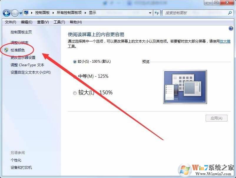 3、看到左側(cè)的校準(zhǔn)顏色了嗎,點(diǎn)擊它;winwin7.com