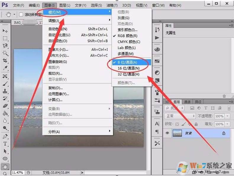 2、選擇模式選項(xiàng),將通道設(shè)置為8位或16位。