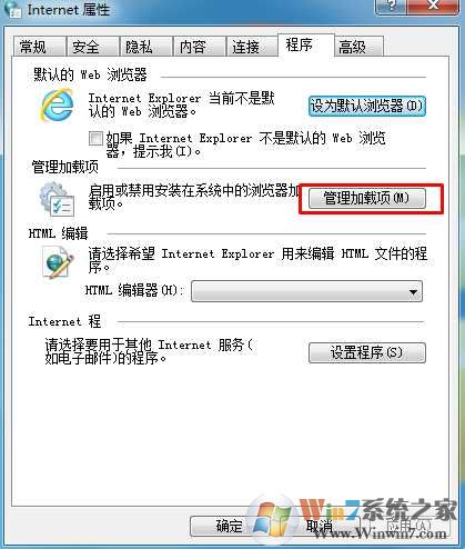 2、在internet選項下,的程序頁面,點擊“管理加載項”;