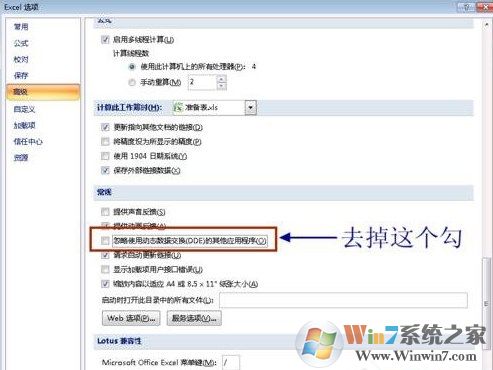 4、去掉“忽略使用動(dòng)態(tài)數(shù)據(jù)交換DDE的其它應(yīng)用程序”前面的勾。確定即可。