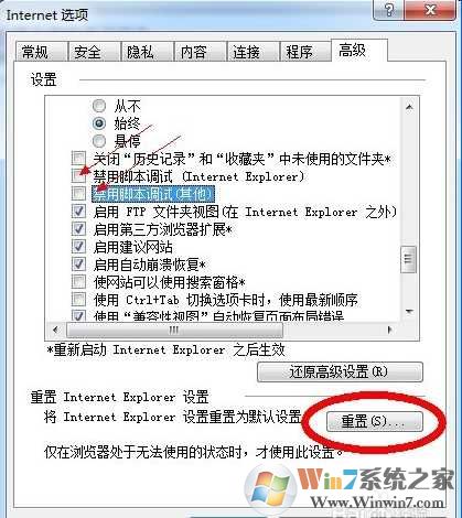 2、 在【高級】設置中“禁止腳本調試”項選中,并確保沒有選中“顯示每個腳本錯誤的通知”即可。