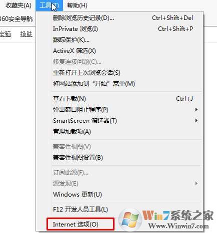 1、打開IE瀏覽器點擊工具,找到Internet選項;(如果IE打不開,也可以通過控制面板來打開internet選項)