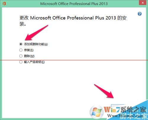 3、在彈出的窗口中選擇”添加或刪除功能“,然后點(diǎn)擊”繼續(xù)“按鈕