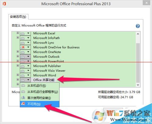 4、在出來的窗口中找到”office共享功能“點(diǎn)擊文字左邊的倒三角,選擇”不可用“然后點(diǎn)擊繼續(xù),在彈出的安全警告對話框中選擇”確定“