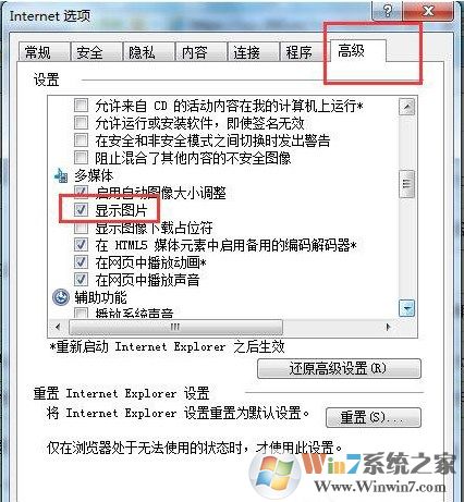 6、在Internet選項(xiàng)中點(diǎn)擊“高級(jí)”勾選“顯示圖片”后確定。