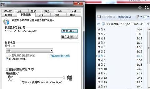 2、打開播放器選項卡在播放器選項卡中選擇翻錄音樂選項卡,在此選項卡設置保存位置(即復制、轉換光盤中文件保存位置,可自定義)、需翻錄轉換的格式(筆者在此選擇常見的MP3格式),設置好點擊確定按鈕,如圖: