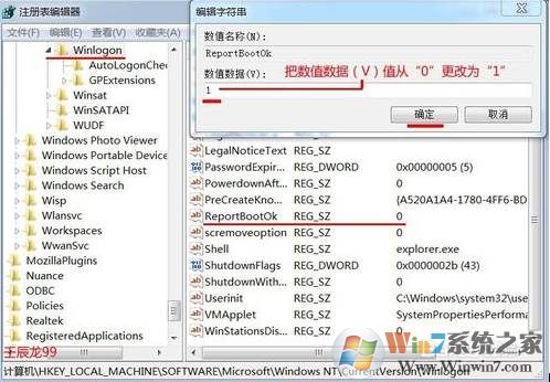 4、展開CurrentVersion,在展開項(xiàng)中找到:Winlogon并左鍵單擊Winlogon,在Winlogon對(duì)應(yīng)的右側(cè)窗口找到:ReportBootOK,并左鍵雙擊ReportBootOK,會(huì)彈出一個(gè)編輯字符串的窗口,如果ReportBootOK的數(shù)值數(shù)據(jù)為:0(禁止寫入LastKnownGood配置文件),我們把這個(gè)數(shù)值數(shù)據(jù)更改為:1 ,然后點(diǎn)擊確定;