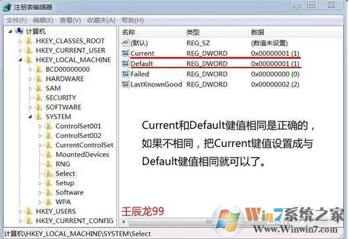 5、查看注冊(cè)表HKEY_LOCAL_MACHINE\SYSTEM\Select里面的Current和Default健值,如果Current和Default健值相同是正確的,如果不相同,把Current鍵值設(shè)置成與Default健值相同就可以了。