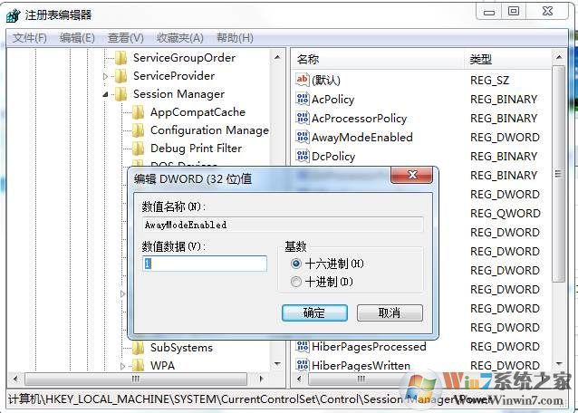 3、把AwayModeEnabled 數(shù)值設(shè)置為1確定,如果沒有該項(xiàng)目,新建一個(gè)DWORD 32位值,命名為AwayModeEnabled再修改數(shù)值即可