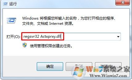 1、使用快捷鍵“Win+R”彈出【運行】,輸入“regsvr32 Actxprxy.dll”,點擊【確定】: