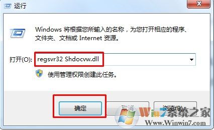 2、再用同樣的方式,使用快捷鍵“Win+R”彈出【運行】,輸入“regsvr32 Shdocvw.dll”,點擊【確定】即可: