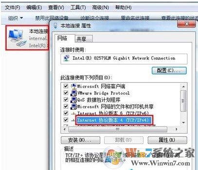 2、點擊【本地連接】右鍵選擇【屬性】,然后雙擊【Internet 協(xié)議版本4(TCP/IPv4)】: