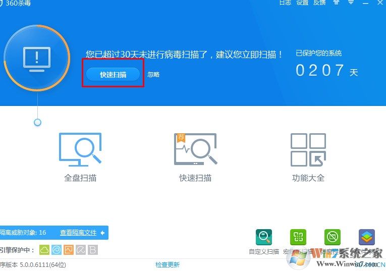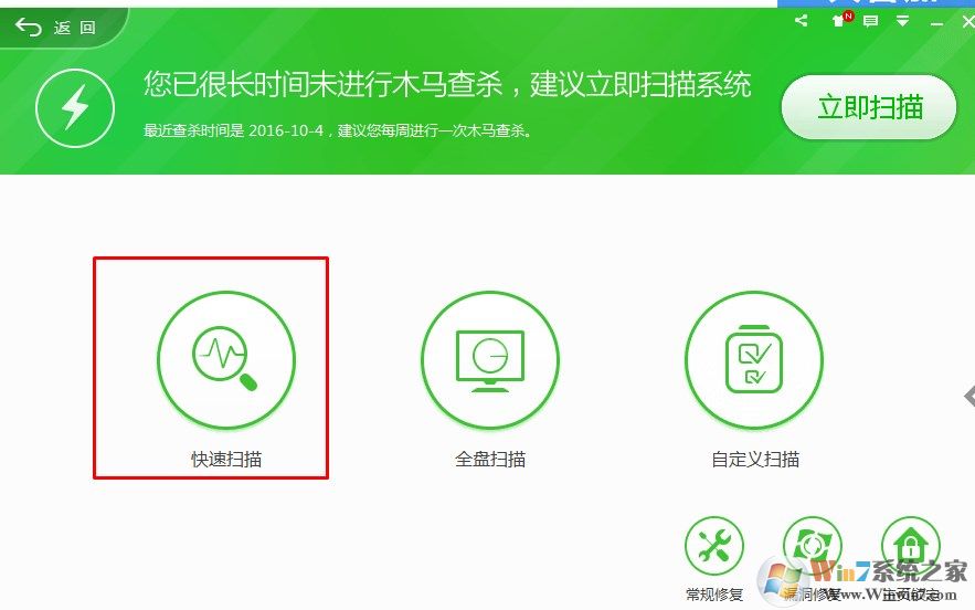 1、此方法是方法一的延伸,如果第一種卸載不了,很可能是電腦中了病毒或潛藏了木馬。這時就需要查殺病毒的工具操作了(還是以360殺毒為例)。打開病毒查殺,然后點擊”全盤掃描“。
