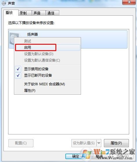 3、我們再用右鍵點擊:揚聲器,在彈出的菜單窗口,左鍵點擊:啟用;
