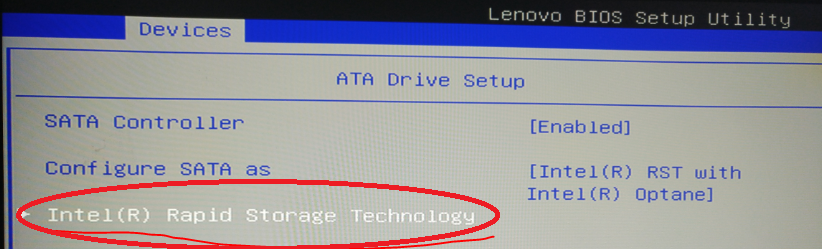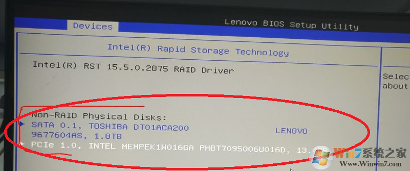 1、打開(kāi)電腦電源,然后按F2或是FN+F2進(jìn)入到BIOS下,依次點(diǎn)擊“setup->device->ATA drive setup->Intel Rapid Storage Technology”,如下圖所示: