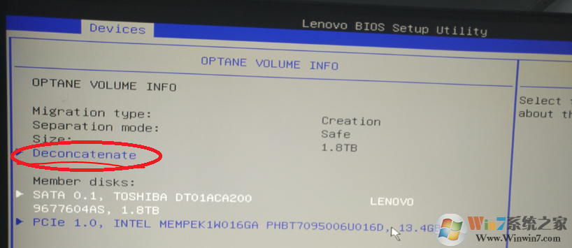 5、選擇“Start deconcatenation”后,確認(rèn)如下圖所示,到此Optane Memory從Enable設(shè)置為Disable,按F10保存退出即可。