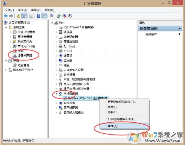2、然后點(diǎn)擊【設(shè)備管理器】-【網(wǎng)卡適配器】-然后選中你的網(wǎng)卡,右鍵點(diǎn)擊屬性(電腦中有幾個(gè)網(wǎng)卡就有幾個(gè)MAC地址,針對(duì)你使用的網(wǎng)絡(luò)修改即可),如下圖所示。