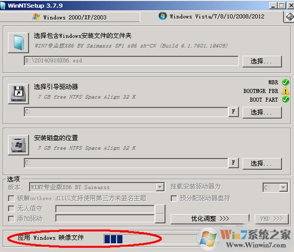 1、打開winntsetup,在“選擇包含windows安裝文件的文件夾”這里,點擊“選擇”找到你的ESD安裝文件。“選擇引導(dǎo)驅(qū)動器”默認(rèn)為C盤,“安裝磁盤的位置”是指你要把系統(tǒng)安裝到哪個盤,比如C盤,或者D盤等。下面的“選項”一欄有一個“版本”,是指的所要安裝的系統(tǒng)的版本,如果ESD文件中有多個版本的話,可以在這里進(jìn)行選擇。“掛載安裝驅(qū)動器”默認(rèn)為C盤。點擊“開始安裝”按鈕,準(zhǔn)備安裝系統(tǒng)。