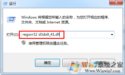 3、然后,打開:開始--》運(yùn)行--》輸入“regsvr32 d3dx9_41.dll”,回車即可解決。