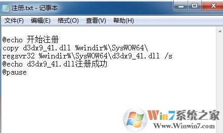 放在文本里面,保存為“注冊(cè).bat”,放到d3dx9_41.dll文件同級(jí)目錄(只要在同一個(gè)文件夾里面有這兩個(gè)文件即可)。