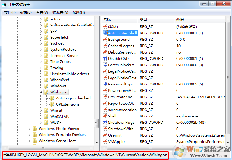 3、依次展開左側(cè)菜單:HKEY_LOCAL_MACHINE\SOFTWARE\Microsoft\Windows NT\CurrentVersion\Winlogon\AutoLogonChecked;