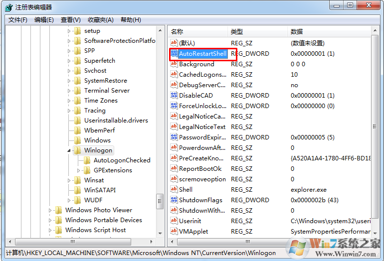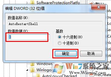 5、將AutoRestartShell數(shù)值修改為1;如果沒有我們就新建一個AutoRestartShell將數(shù)值設(shè)定為1即可