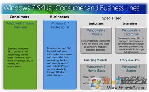 從圖中我們可以看出,從簡易版、家庭普通版、家庭高級版、專業(yè)版到旗艦版,功能是越來越多,但是針對普通消費者的只有Windows? 7 家庭高級版,這個是最適合于普通消費者、家庭用戶的,當然,我也覺得它最適合于大學(xué)生了,家庭高級版通過零售渠道發(fā)售;而Windows 7 專業(yè)版呢則是適合于中小型企業(yè)的,因為它能夠滿足中小型企業(yè)的網(wǎng)絡(luò)備份需求、高級安全性驗證需求和服務(wù)器/客戶端架構(gòu)需求,專業(yè)版本通過OEM和零售渠道發(fā)售;對于剩下的旗艦版、企業(yè)版、家庭普通版和簡易版都屬于專門用途的版本了。