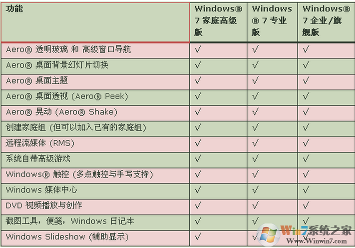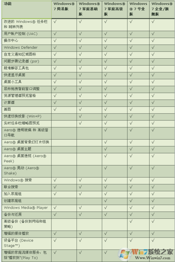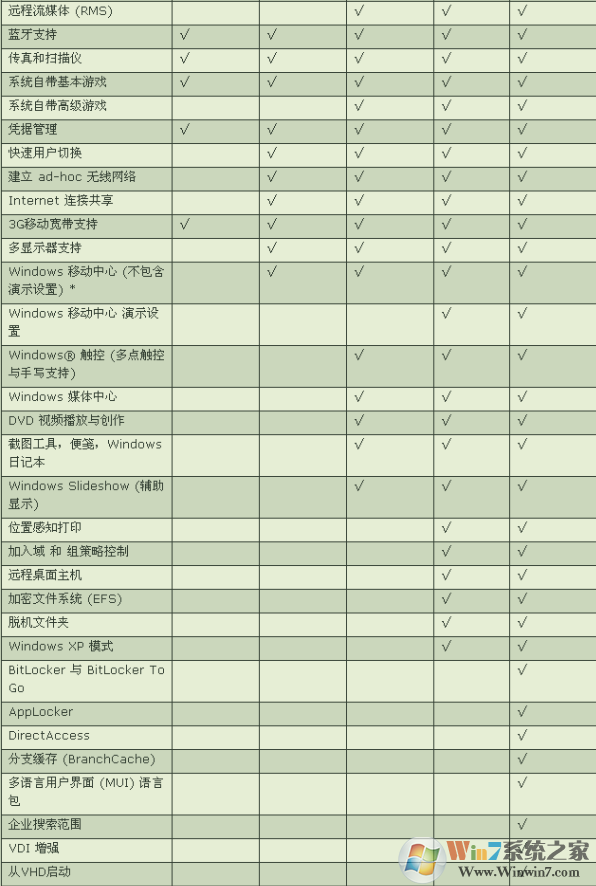 最后,提供六大版本W(wǎng)indows 7主要功能的詳細對比 ,如下表所示:(含有"√"表明具備此功能,不含則不具備;注意:根據(jù)自己需要推動鼠標滑輪或者點擊圖片查看原圖)