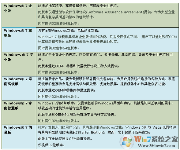 接下來給出一張表格,詳細說明六大版本的一些適用環(huán)境,非常明晰:(注意:根據(jù)自己需要推動鼠標滑輪或者點擊圖片查看原圖)