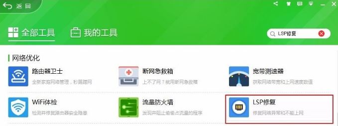 1、使用360安全衛(wèi)士LSP修復(fù)工具,工具路徑(我用的是領(lǐng)航版):點(diǎn)擊右下角“更多”,彈出如圖界面,找到并點(diǎn)擊LSP修復(fù)工具,如圖: