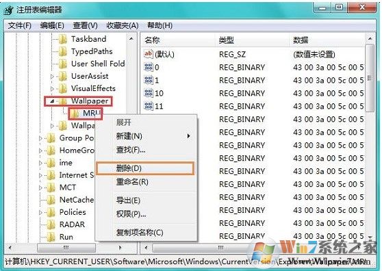 2、依次找到以下位置:HKEY_CURRENT_USER╲Software╲Microsoft╲Windows╲CurrentVersion╲Explorer╲Wallpapers,只要刪除里面的所有內(nèi)容,按“F5”刷新;