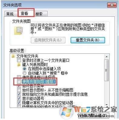 4、在文件夾選項(xiàng)窗口中,切換到查看選項(xiàng)卡,接著將高級設(shè)置下的“使用共享向?qū)?rdquo;選項(xiàng)前的勾去掉,如圖所示: