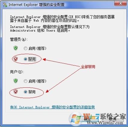 3、在彈出的Internet Explorer增強的安全配置框中,全部選擇“禁用”,然后確定。