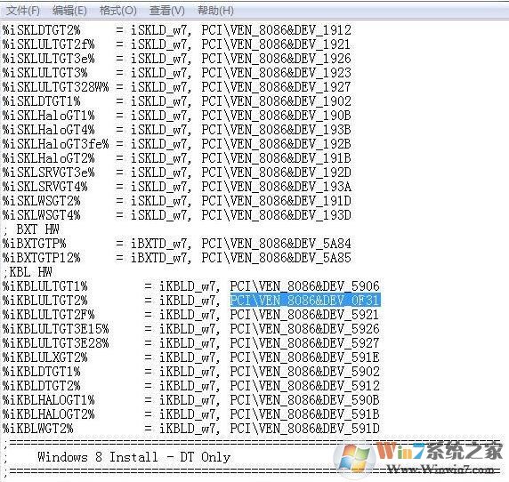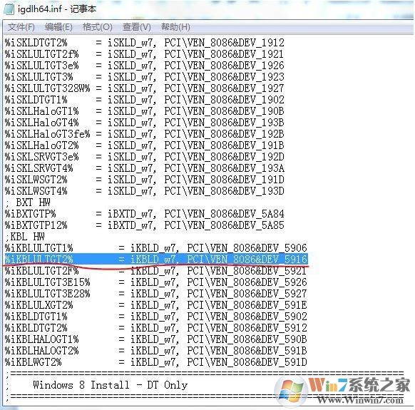 6.以文本的形式打開igdlh64.inf文件。找到“%iKBLULTGT2% = iKBLD_w7, PCI\VEN_8086&DEV_5916”,這一段,把PCI\VEN_8086&DEV_5916替換成剛剛復制的硬件ID。
