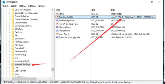 2、將鼠標(biāo)選中HKEY_LOCAL_MACHINE,按“Ctrl+F”查找“127.0.0.1”,當(dāng)搜索到文件夾名為“Internet Settings”的文件夾,將"Internet Settings"這個文件夾以及里面的內(nèi)容全部都刪除。